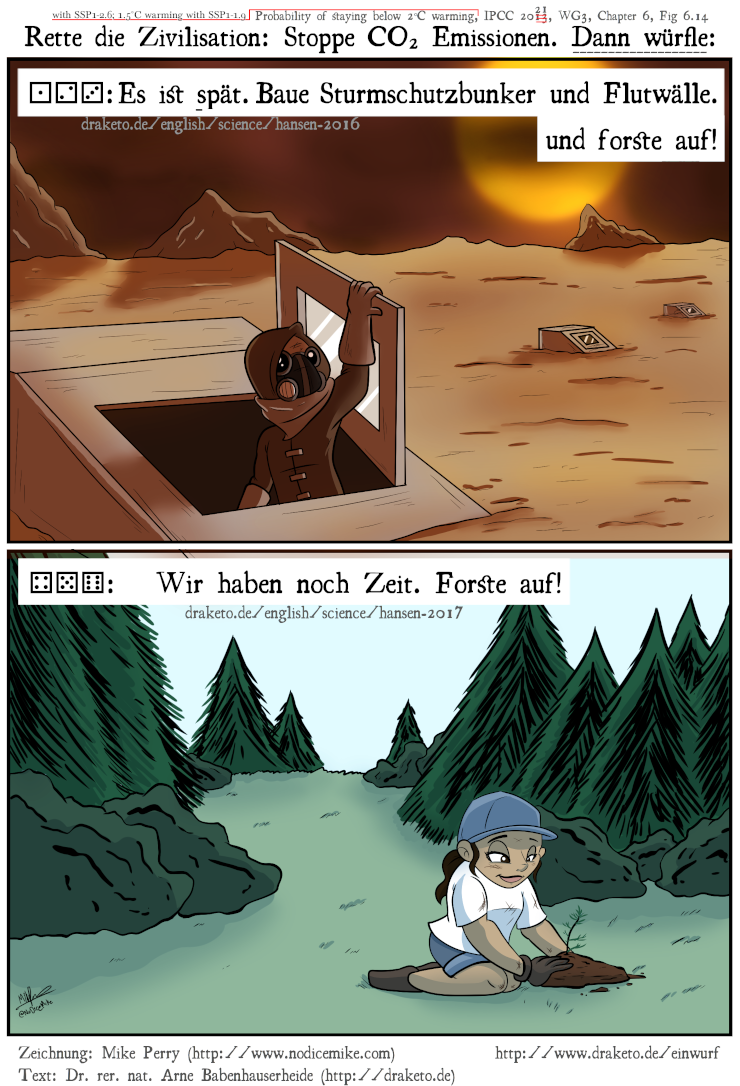 Es ist Zeit für uns, als Menschheit zusammenzustehen und unsere Heimatwelt zu schützen. Selbst wenn du nicht bereit bist darauf zu wetten, keine 1 gewürfelt zu haben, hilf bitte jetzt, Emissionen zu reduzieren. Die düstere Zukunft kann noch viel düsterer werden, wenn wir das nicht machen. Verwende ein Fahrrad, wenn du kannst. Verwende öffentliche Verkehrsmittel. Wenn du ein Auto brauchst, triff die Kaufentscheidung anhand seiner CO₂ Emissionen. Kaufe Strom aus Erneuerbaren Energiequellen. Iss weniger Fleisch (höchstens 300g pro Woche). Wähle diejenigen, die dafür kämpfen, die globale Erwärmung abzumildern und den Klimawandel verkraftbar zu halten.