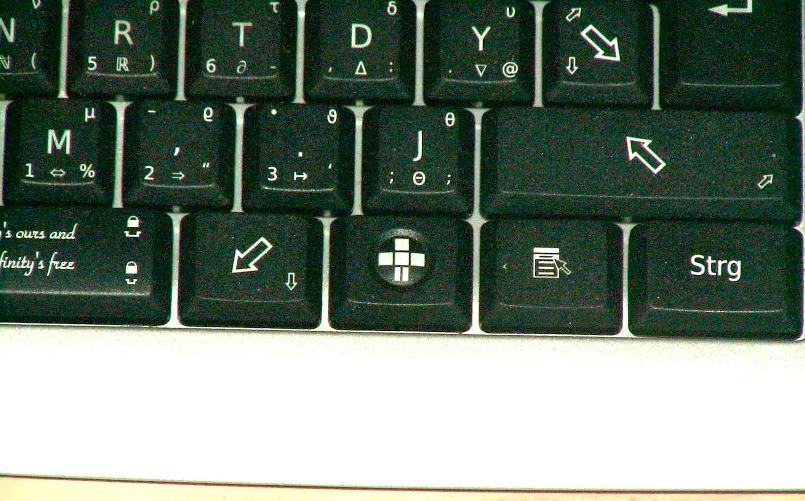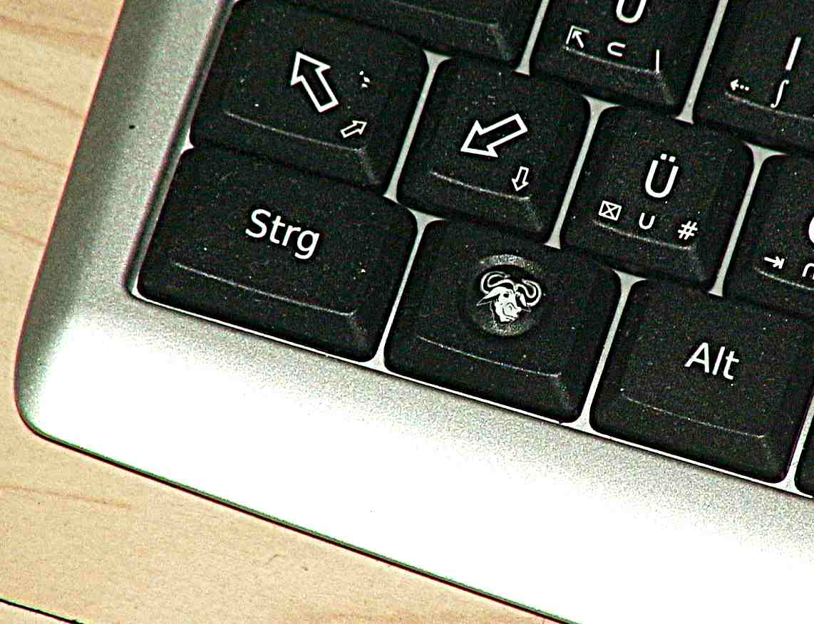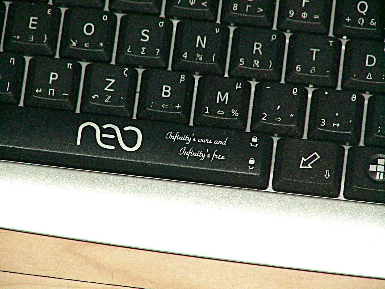 Dank dem GNU Head redrawn und Neo-Tastatur.de habe ich eine Tastatur, die meine Begeisterung für freie Software zeigt: Mit GNU, Plussy und Infinite Hands. Außerdem enthält sie die für wissenschaftliches Schreiben praktischen mathematischen und griechischen Zeichen, die Neo bietet. Aber genug geschrieben: Geben wir der Tastatur das Rampenlicht, das sie verdient ;-)